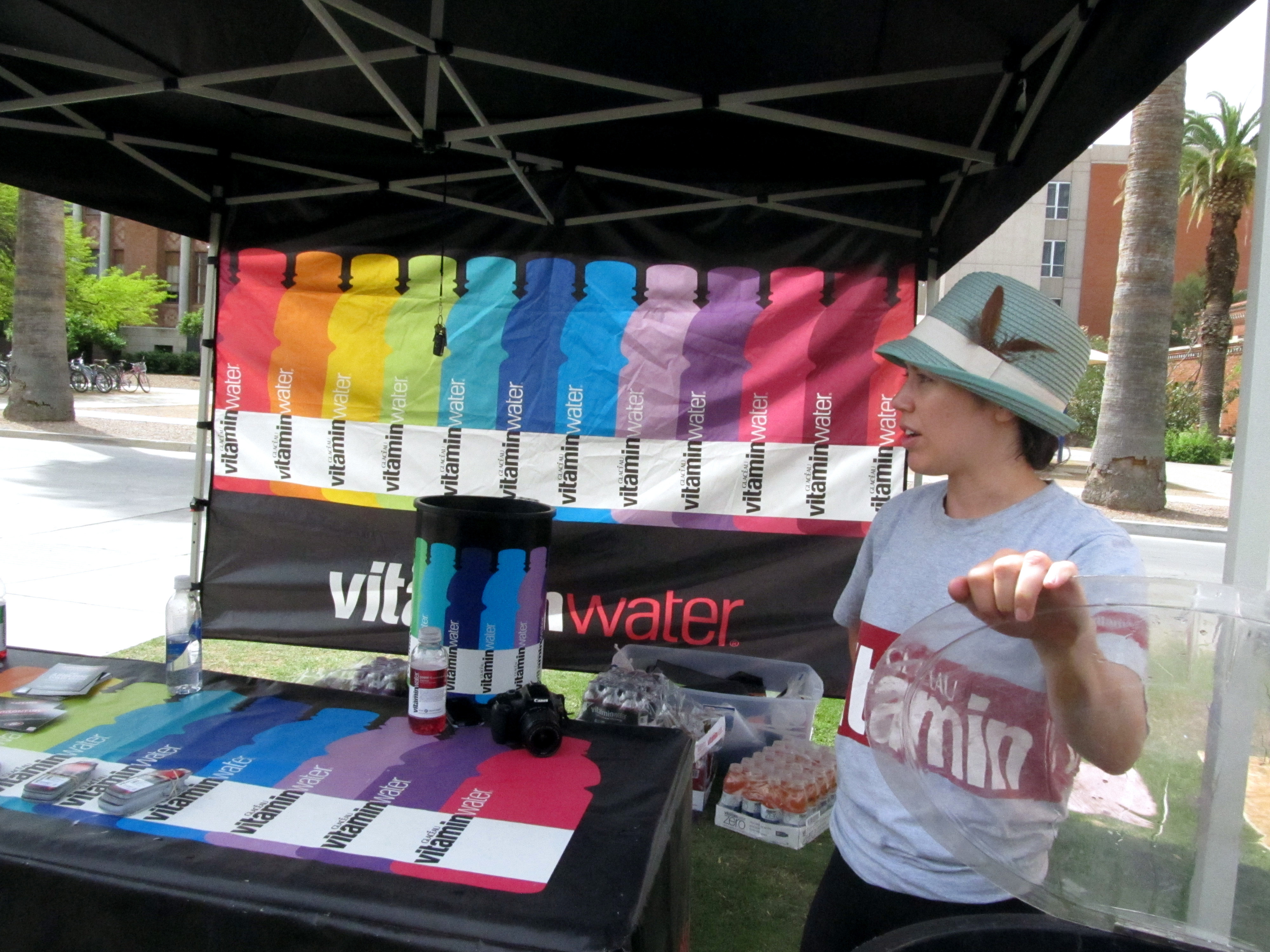ASSIGNMENT #11 GENERAL NEWS 203 SPRING 2012 Previous Next Published January 4, 2013 at 4000 × 3000 in Photojournalism Portfolio (Spring Semester 2012) Wendy Neville hands out free Vitamin Water on the University of Arizona Mall on Tuesday, April 10, in Tucson, Ariz. The promotion highlights a new flavor as well as a new bottle shape. (Photograph by Kayla Samoy)